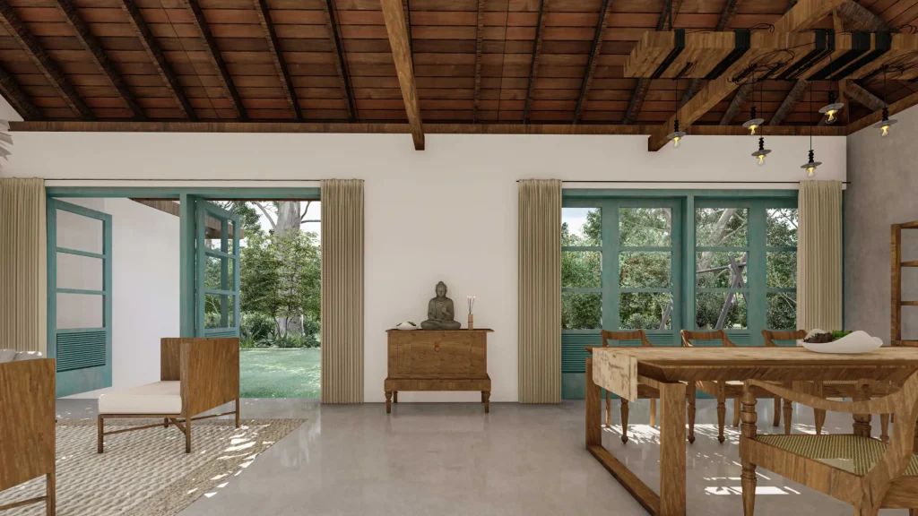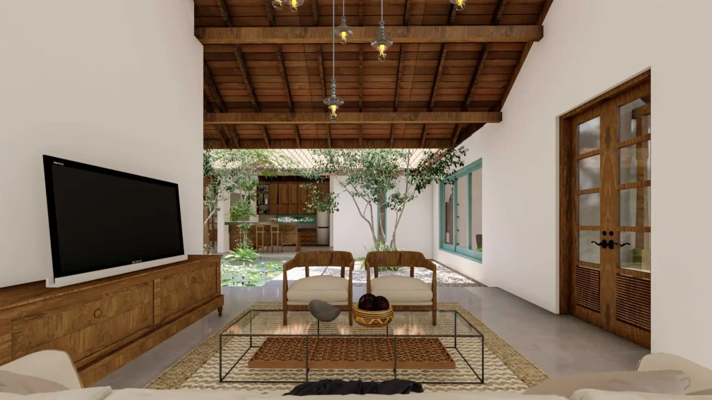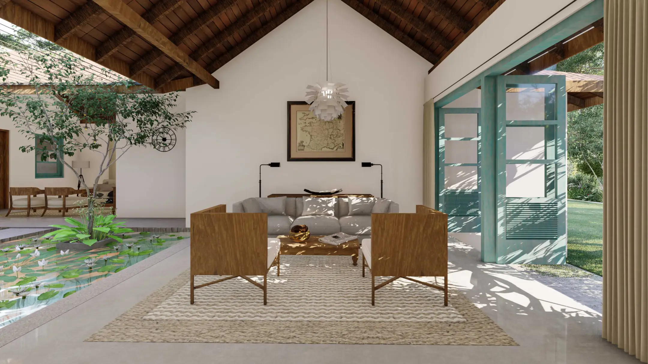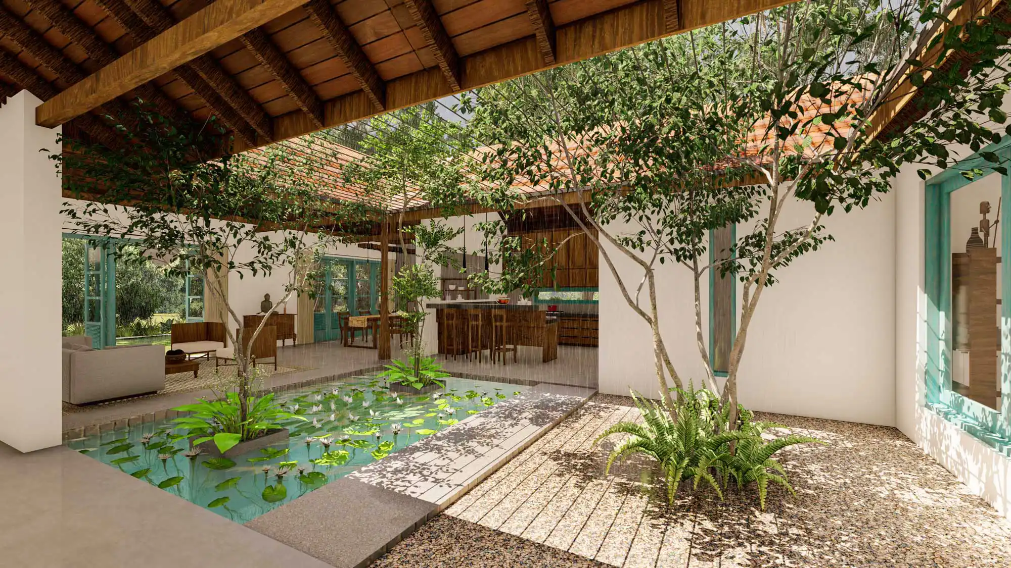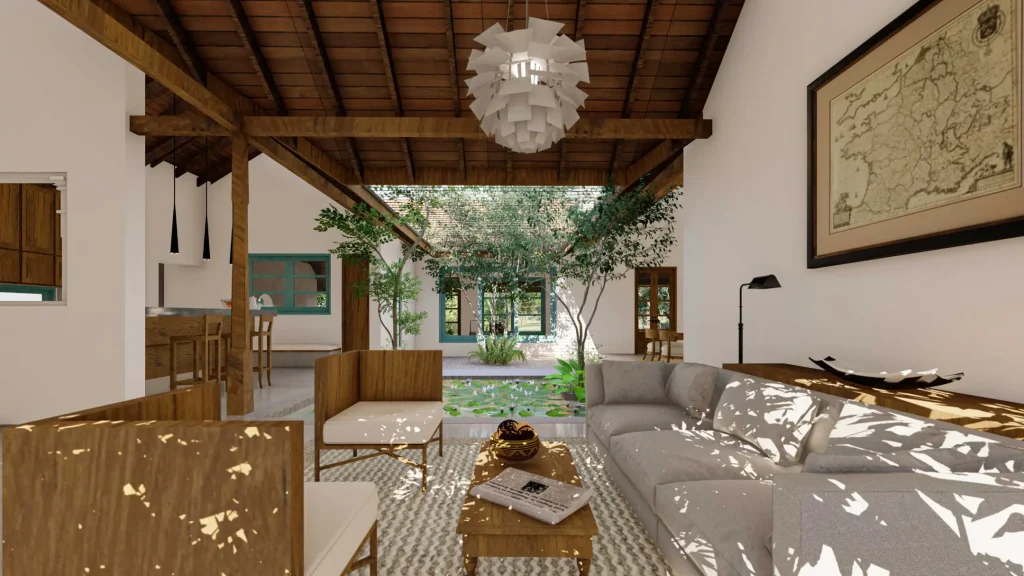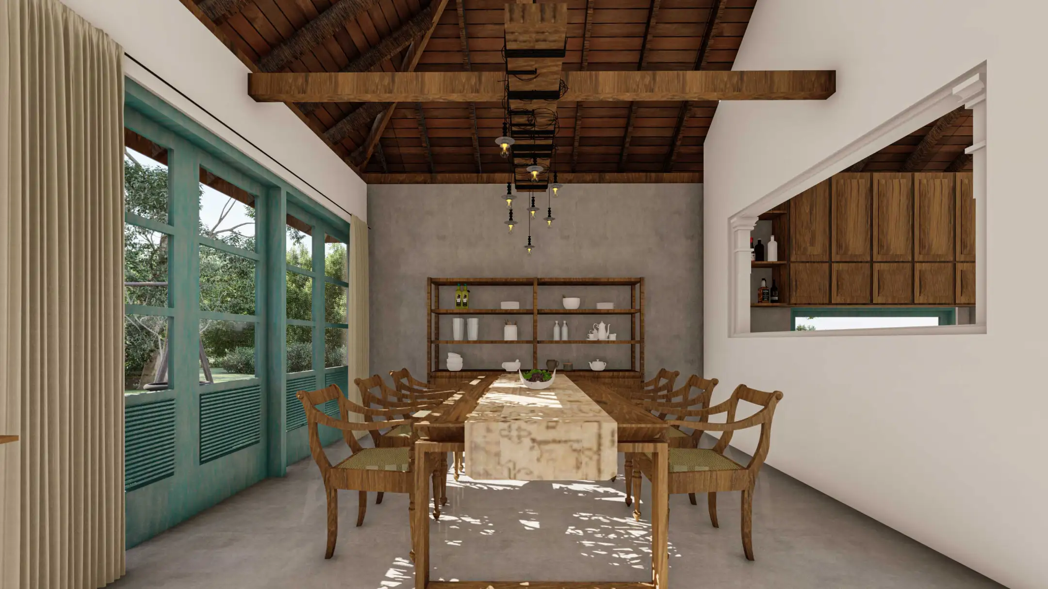 Inside, the kitchen and dining area form a warm daily hub. A relaxing lounge sits close to the courtyard and opens to its views. The living area supports gatherings, while two bedrooms offer privacy and rest. The overall layout keeps the traditional sense of openness, shade and gentle transitions between indoor and outdoor life.