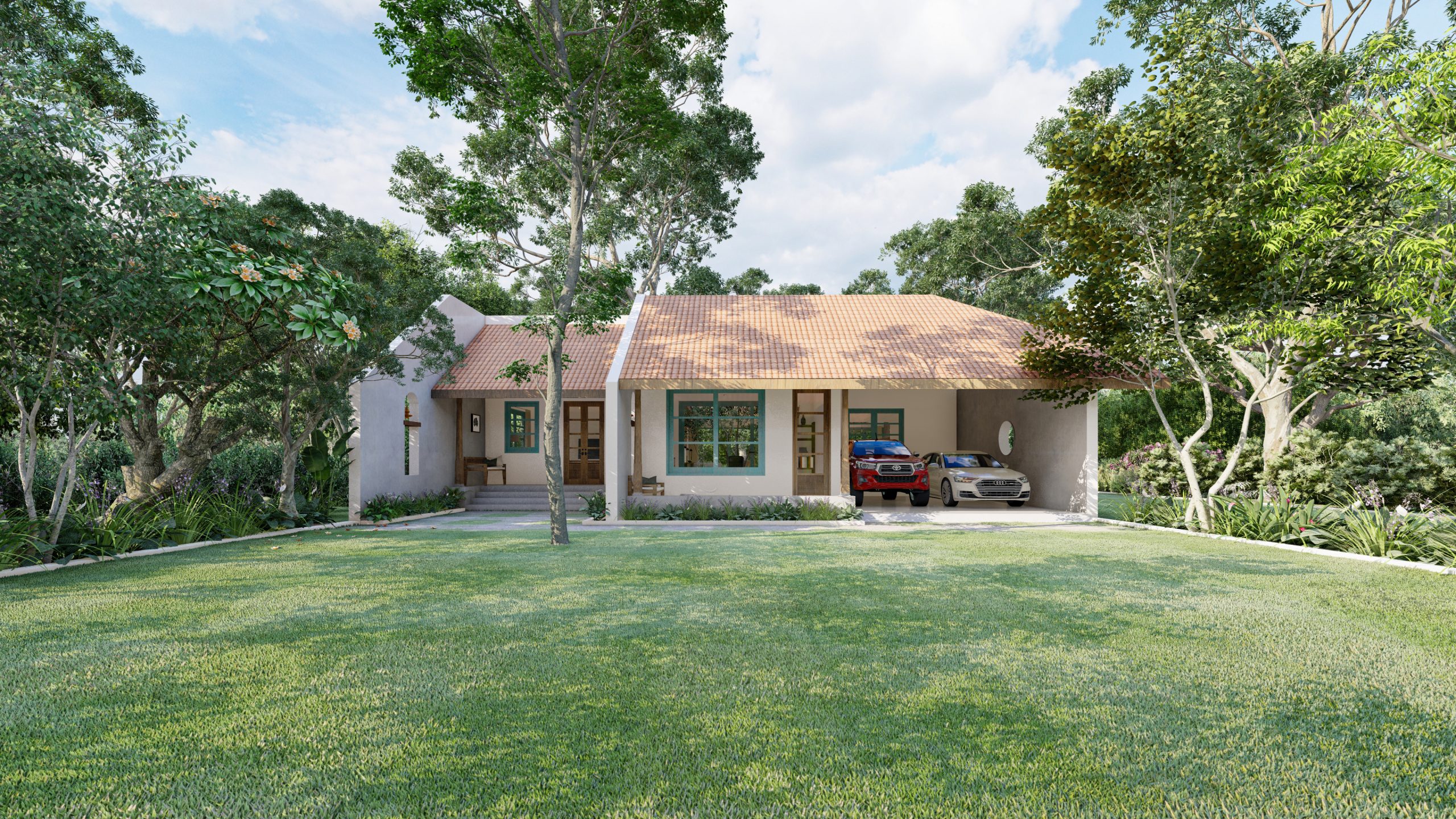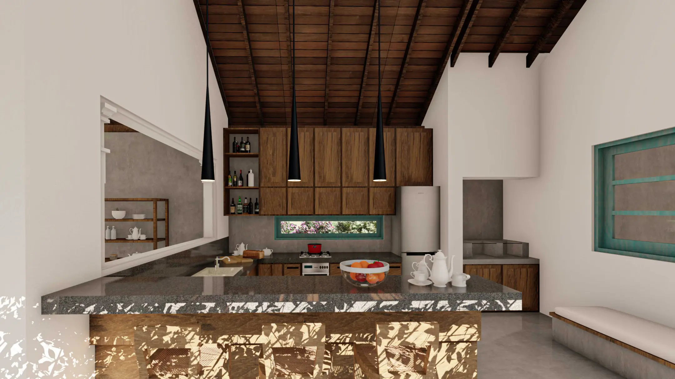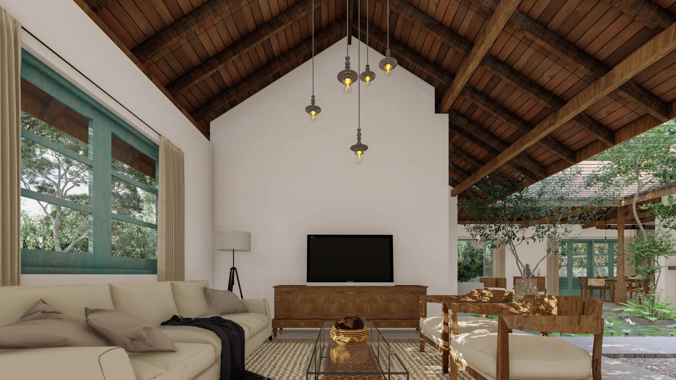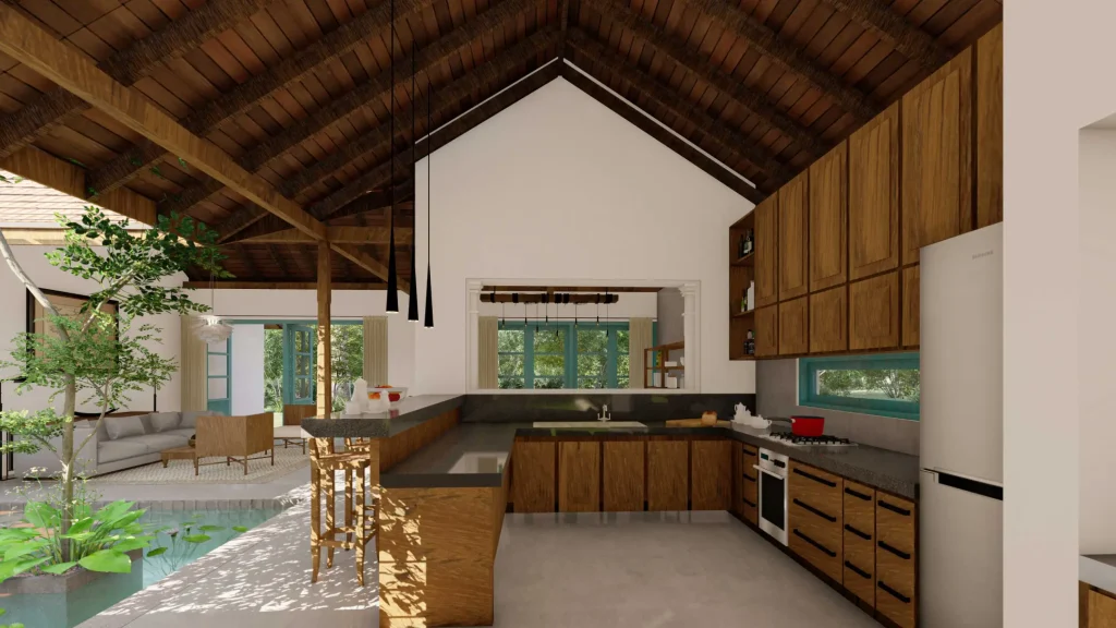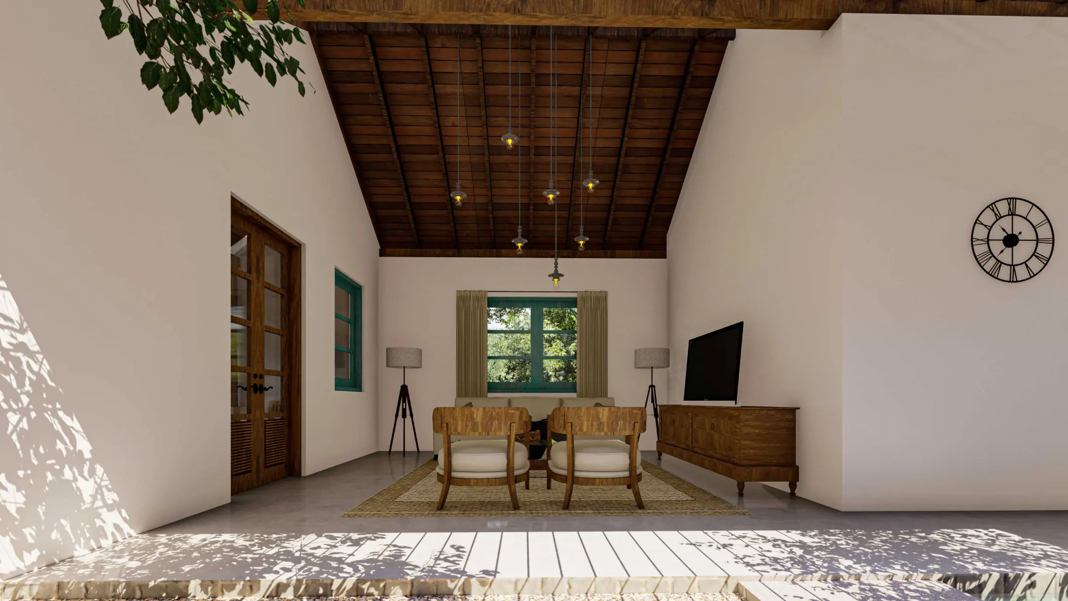Inside, the kitchen and dining area form a warm daily hub. A relaxing lounge sits close to the courtyard and opens to its views. The living area supports gatherings, while two bedrooms offer privacy and rest. The overall layout keeps the traditional sense of openness, shade and gentle transitions between indoor and outdoor life.