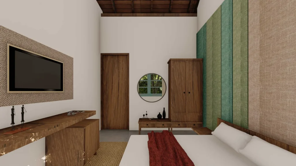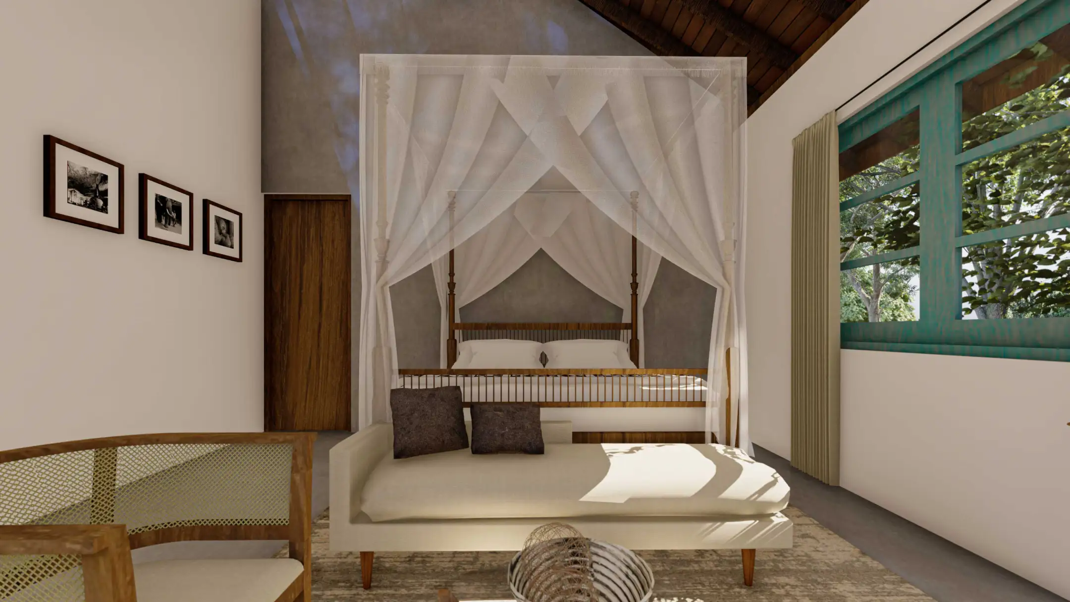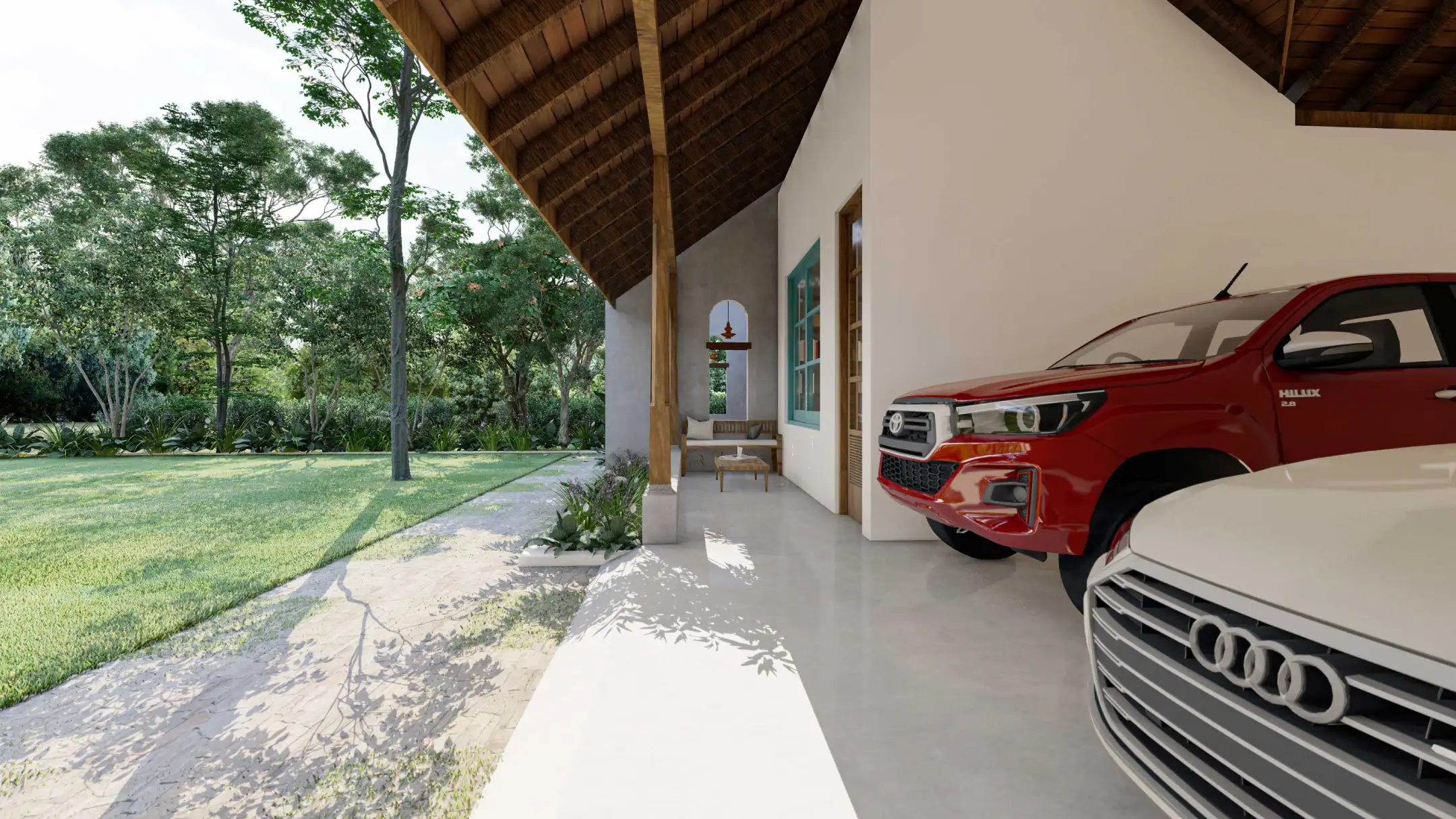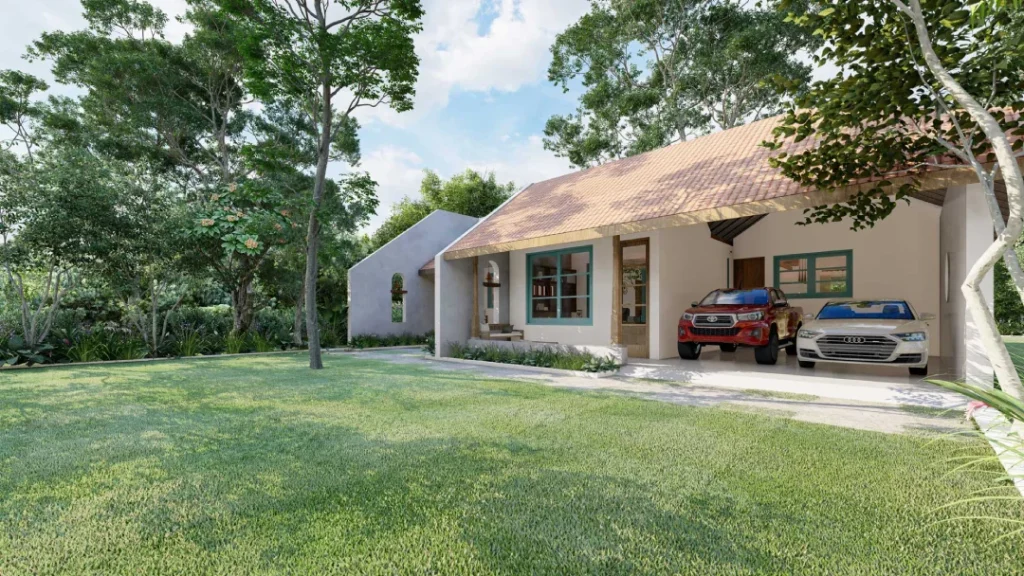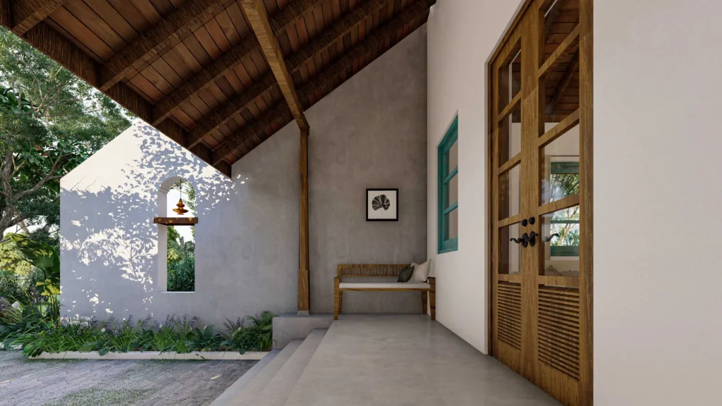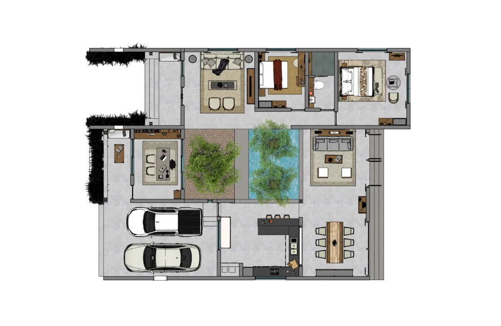 Inside, the kitchen and dining area form a warm daily hub. A relaxing lounge sits close to the courtyard and opens to its views. The living area supports gatherings, while two bedrooms offer privacy and rest. The overall layout keeps the traditional sense of openness, shade and gentle transitions between indoor and outdoor life.